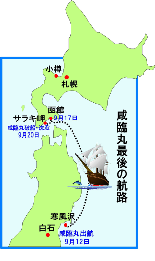 戊辰戦争後、咸臨丸は輸送船として開拓使の物資や官吏の輸送などにあたりました。1871年、北海道に移住する仙台藩白石の片倉家家臣団401名を乗せて、松島湾の寒風沢(さぶさわ)から出帆しました。しかし11月2日(陰暦9月20日)、函館から小樽へ向う途中、木古内(きこない)のサラキ岬で暗礁に乗り上げて座礁。全員無事救助されましたが、咸臨丸は沈没。終焉を迎えました。【主な参考文献】